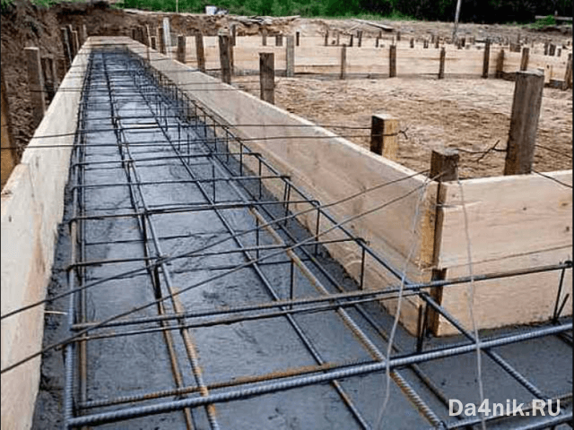 Последним и ответственным этапам становится заливка бетоном фундамента.