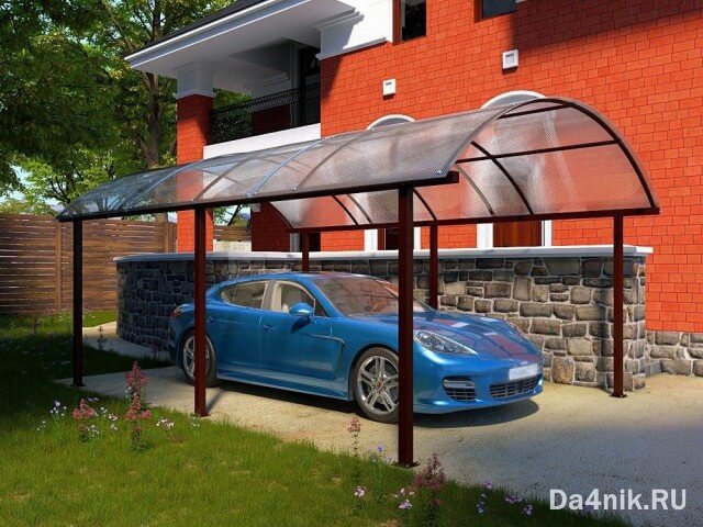 - арочное сооружение по характеристикам похоже на двускатный навес, но без центрального ребра, зато монтаж данной поликарбонатной конструкции требует специальных инструментов и навыков по сгибанию металлического профиля;