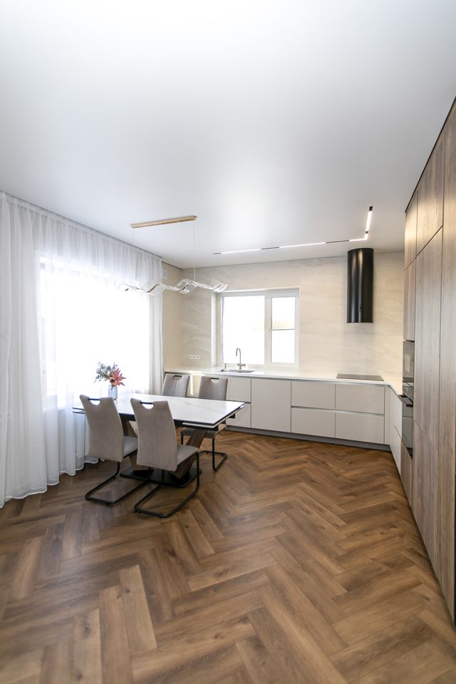 Освещение также имеет большое значение: сочетание потолочных светильников, точечных ламп над рабочими зонами и декоративной подсветки создает комфортную атмосферу.