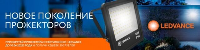 Приобретайте прожекторы и светильники LEDVANCE или OSRAM на сумму от 3000 рублей до 30.06.20222 года, регистрируйте чек на date.elektro.ru и получайте кешбэк на мобильный телефон 300 рублей*.