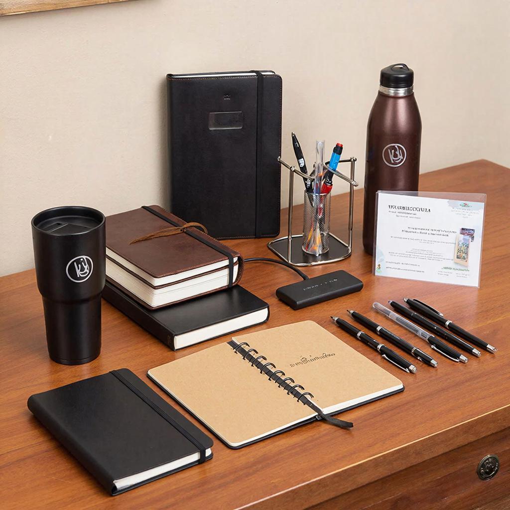 - Качественная канцелярия: брендированные ежедневники, ручки премиум-класса, настольные органайзеры.