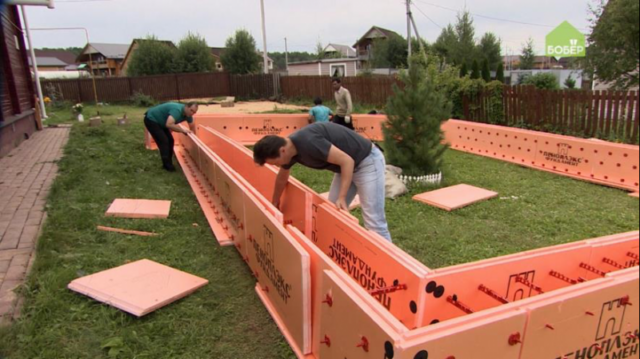 Используя несъёмную опалубку, работы по возведению опалубки и теплоизоляции фундамента объединяются в один общий технологический цикл. Комбинация этих двух стадий позволяет сэкономить время и ускорить процесс возведения дома.