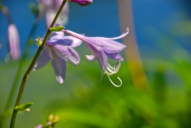 Интересно! В период цветения в центре хосты вырастает длинный стебель, на котором распускаются соцветия с цветками в форме колокольчиков.