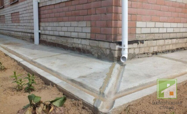 - Выполнить повторную заливку раствора. При этом важно создать небольшой уклон в сторону удаленного от дома края конструкции.